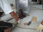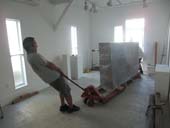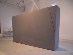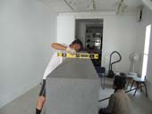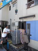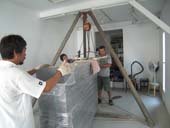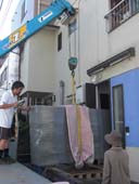 静謐な空間性をもつ作品です。 この作品と対峙して、坐してみたくなる衝動にかられる。 かつて、米 ヒューストンにある“ロスコ チャペル”を訪ねた時にも 同じような衝動にかられ、ロスコの壁画に包まれ、半時ほど坐さしていただいた。 心を平安が支配し、心身ともに充実したことを思い出す。 今日は、裏話で搬入風景を披露します。 「あの電話線をクリアするのは大変だなぁ」 「想定通りにクリア!」 先ずは、半分を 吊り手の位置を変えて、リフターと台車に載せて ぎりぎりまで室内へ あとは、人力で引っ張り込む 作品の対角線にほど近い面を画廊壁面に並行する位置に微調整 慎重に慎重にセッティング 上面の水平を底に薄い板をかませて微調整 神経を集中して4時間がかりで、 3300キロの石彫刻は堂々と鎮座した。 ギャラリー空間には、1点だけ。 画廊の空間は静寂そのもの。 作品を鑑賞するというより、静寂な空間を体験するって感じ。 |